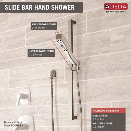 - Hand shower package includes: hand shower, slide bar, and hose