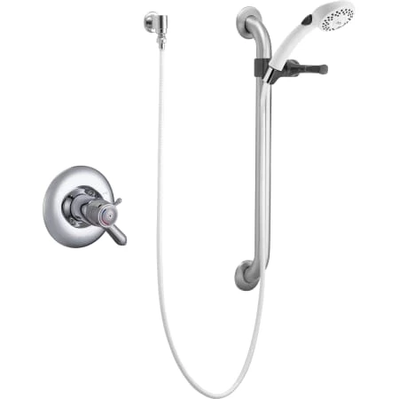 Single Handle Shower Valve Trim with Metal Lever Volume Control Handle with Temperature Adjustment and Personal Hand Shower with 24″ Grab / Slide Bar from the Commercial Series