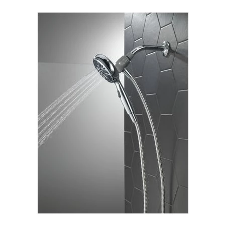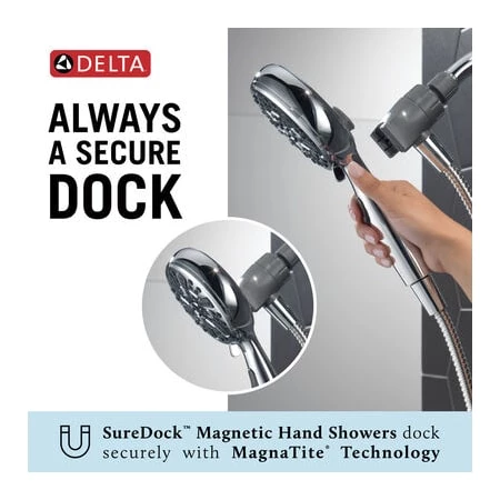 Experience a better shower with the control and flexibility of a Delta® hand shower. Great for showering yourself or your loved ones and pets, as well as for keeping your shower and tub clean. SureDock® Magnetic Hand Showers bring reliable docking within reach. An integrated magnet on the back of the hand shower snaps your hand shower into place and holds it there, so it stays docked when not in use and doesn’t droop over time. While other products may gather unsightly mineral build-up over time, Delta soft rubber Touch-Clean® spray holes allow any mineral residue to simply be wiped away for an instantly refreshed look — with no need for soaking or the aid of chemical cleaners. The pause setting gives you ample space for shaving, lathering and other shower tasks, without worrying about overspray or water waste. This spray setting helps you conserve water, so you can worry less about depleting your supply of hot water — and you help the environment too. Delta WaterSense labeled faucets, showers and toilets use at least 20% less water than the industry standard — helping you save water without compromising performance.