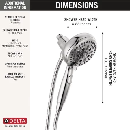 Delta® SureDock™ Hand Showers bring reliable docking within reach. A sturdy hook on the back of the shower head ensures it mounts securely every time. The location of the mount on the back of the shower head lowers the handle to a more easily-accessible height, so you can remove, use and redock your hand shower with ease. Delta H2Okinetic® PowerDrench® Showers look different because they are different. H2Okinetic showers are powered by an innovative technology that sculpts the water into a unique wave pattern, giving you the feeling of more water without using more water and creating a shower with more warmth, coverage and intensity. So go ahead and indulge, because now you can enjoy the feeling of more water without using more water. While other products may gather unsightly mineral build-up over time, Delta soft rubber Touch-Clean® spray holes allow any mineral residue to simply be wiped away for an instantly refreshed look – with no need for soaking or the aid of chemical cleaners. The pause setting gives you ample space for shaving, lathering and other shower tasks, without worrying about overspray or water waste. This spray setting helps you conserve water, so you can worry less about depleting your supply of hot water – and you help the environment too.