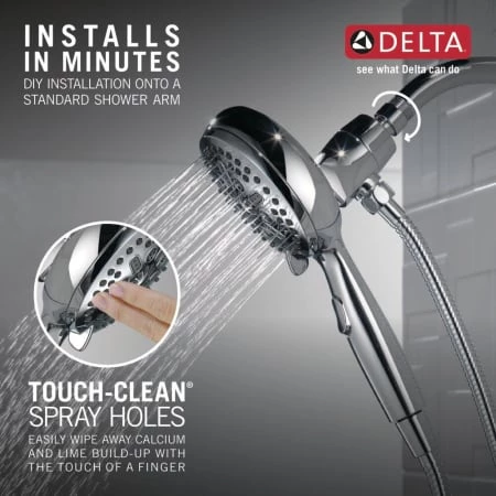 - Touch-Clean: The Delta soft, rubber Touch-Clean Spray Holes make it easy to wipe away unsightly calcium and lime buildup with the touch of a finger, helping prevent your product from developing a mineral blockage which could reduce water flow. While other kitchen faucets, shower heads and hand showers may require chemical cleaners and soaking time to dissolve mineral buildup, Delta products featuring Touch-Clean Spray Holes can be simply wiped clean for improved performance and an instantly refreshed look.